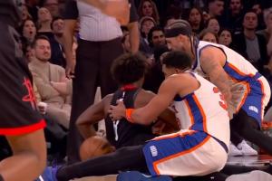 防守建功!布伦森奋力堵枪眼 造成阿门进攻犯规