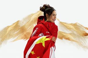荣耀加冕!谷爱凌头戴金色头纱领取金牌,与李方慧身披国旗庆祝