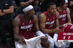 此役,热火球星阿德巴约状态神勇,前三节狂轰62分,不仅打破了队史单场得分纪录(詹姆斯61分),比肩科比三节62分神迹。