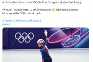 英国奥运队的官推赛后写道:“速度滑冰选手尼尔·特雷西在1500米决赛中获得第九名。能够走到这一步,已经是相当了不起的成就了👏 尼尔将在周一的500米短道比赛中再次亮相。”