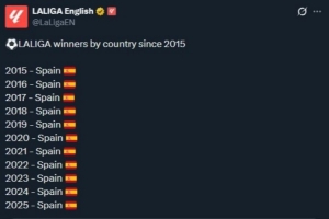西甲官推随后转发了这条动态,并表示:“西班牙包揽了2015年至今的所有西甲冠军。”