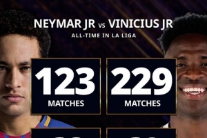 体育资讯2月21日讯 维尼修斯在西甲比赛中打进69球,超越内马尔,环球足球奖对比了两人的西甲数据。
