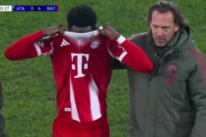 记者:阿方索·戴维斯疑似旧伤复发,穆西亚拉一瘸一拐登上大巴
